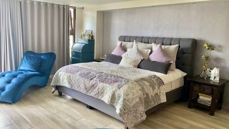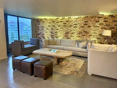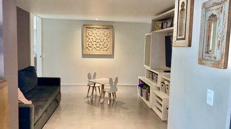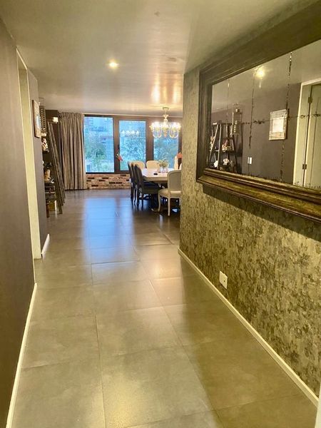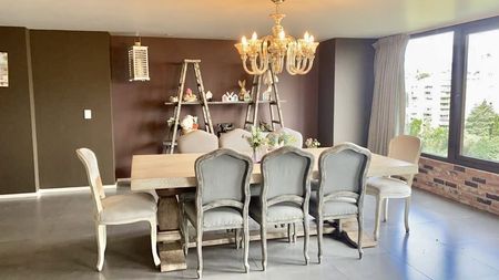 Departamento con elevador al piso, 3 recámaras cada una con su baño y vestidor, cuarto de T.V. , oficina, sala, comedor, cocina cerrada, área de lavandería, cuarto de servicio con baño, estacionamiento para 2 autos y amplia bodega.