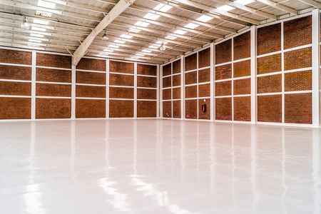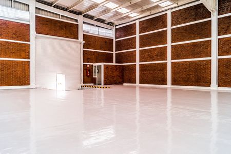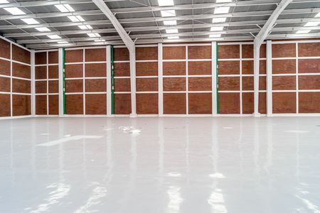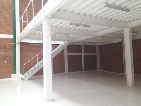 Piso de concreto armado Pulido, con terminado epóxico y sellado con una capacidad de 3 toneladas xm2 en planta baja y 1.5 toneladas por m2 en mezzanine.