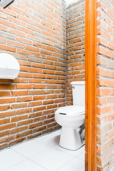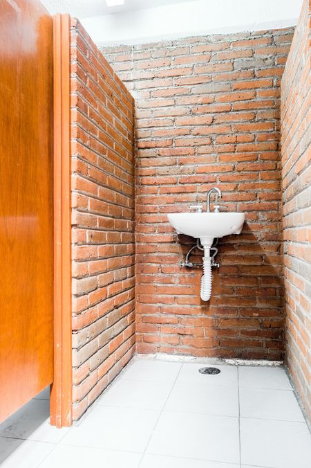 Muros de tabique SANTA JULIA al frente, tabique rojo en las paredes al fondo y laterales.
