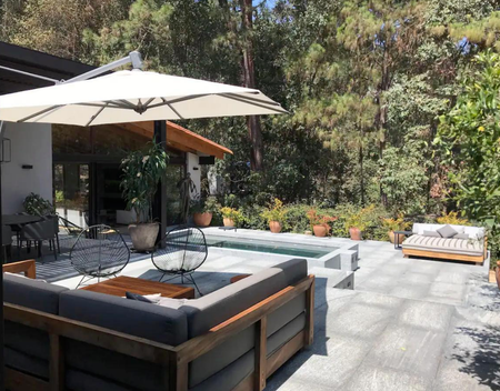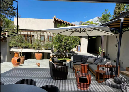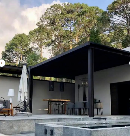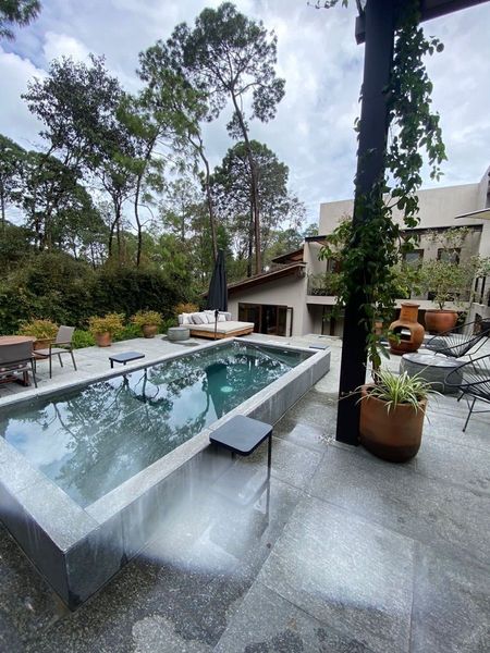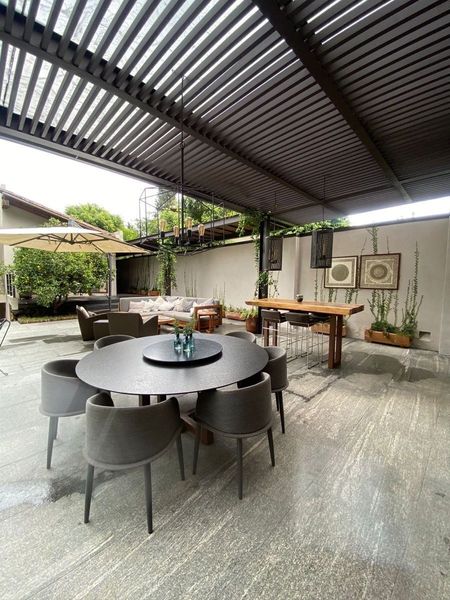 grand terraza area abierto a con pileta jacuzzi, comedor , sala con chimenea.