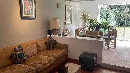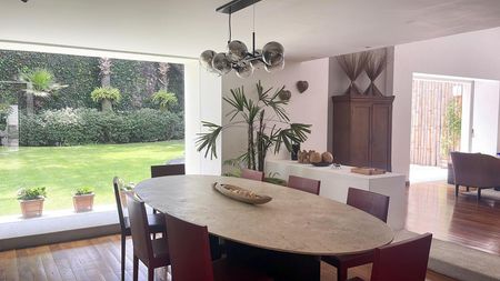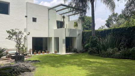 Cuenta con sala, comedor con vista al jardín, cocina, family room en vestíbulo, despensa, cuatro recamáras con baño cada una, dos de ellas con pequeña terraza, cuarto de servicio y bodega y dos cocheras.