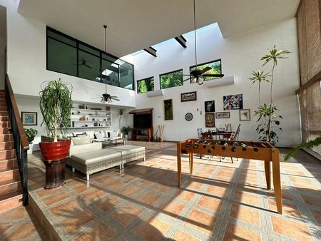 - Sala y área de juegos con doble altura y ventanales de piso a techo con vista al lago