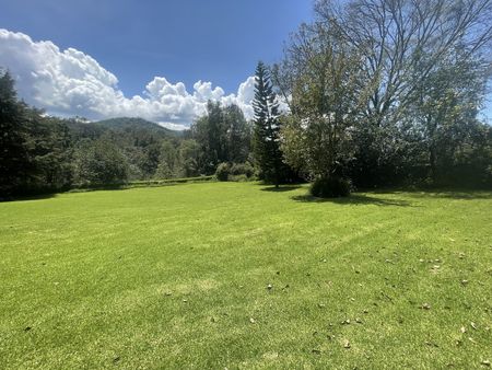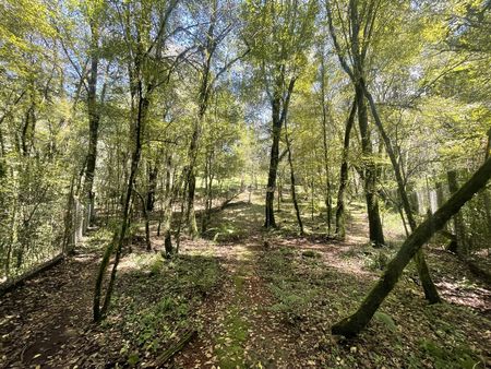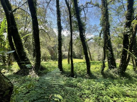 de árboles para hacer senderismo. Colinda con un rio.