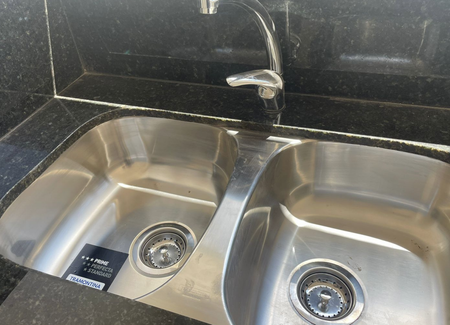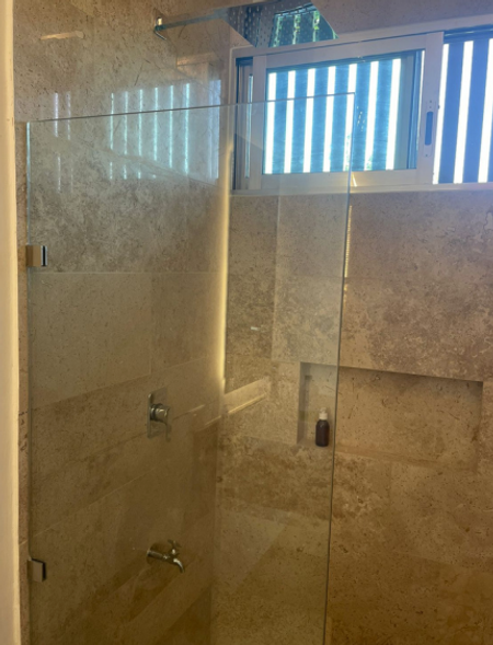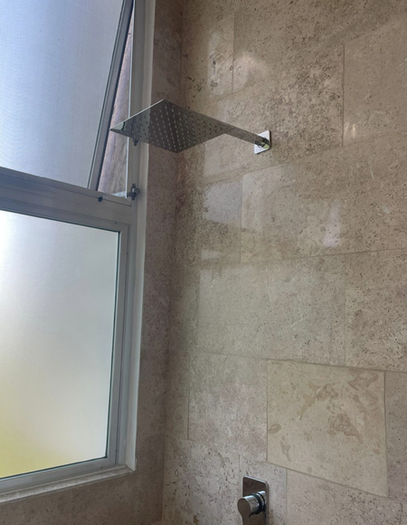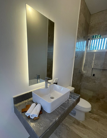 -Mesetas de mármol Santo Tomás en baños y de granito ubatuba en cocina.