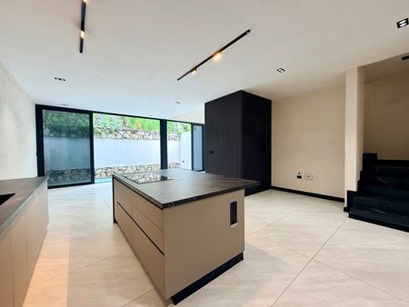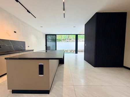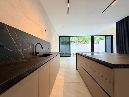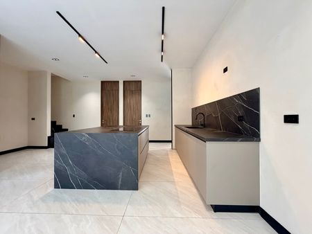 Cocina equipada con isla de piedra tecnológica con salida para instalación de gas y salida de energía a 220v para estufa de inducción (incluye estufa smeg de inducción ya instalada, tarja schock y griferia Moen de cuarzo y resina)