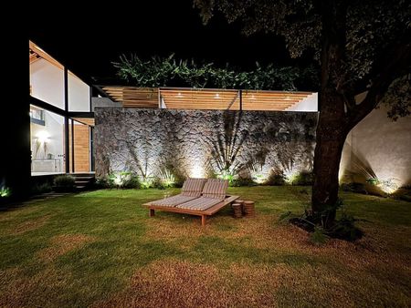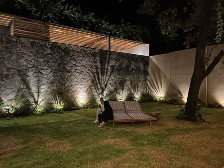 • Jardín plano con paisajismo y muro de piedra labrada (152 m2).