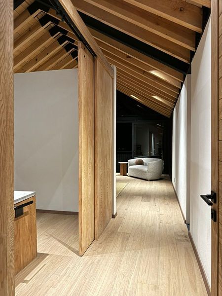 • Techo de vigas de madera a dos aguas con placas de conexión.