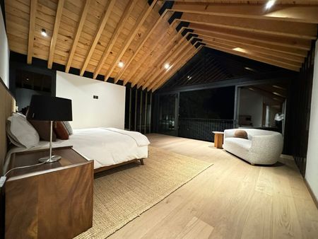 • Sala – comedor – cocina abierta con altura de 3.30 metros, sala con chimenea y balcón, todo con vista panorámica.