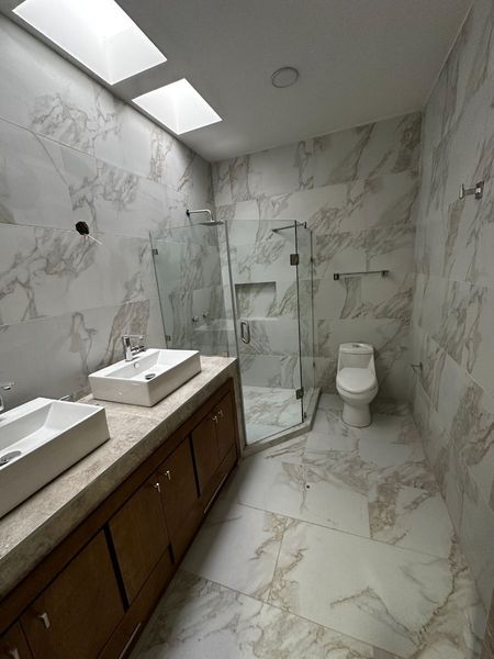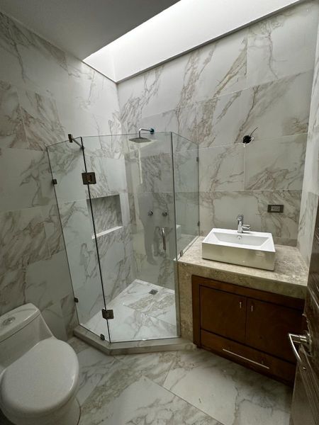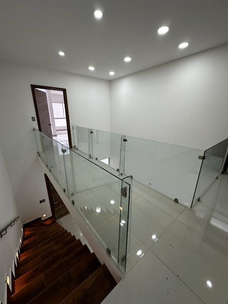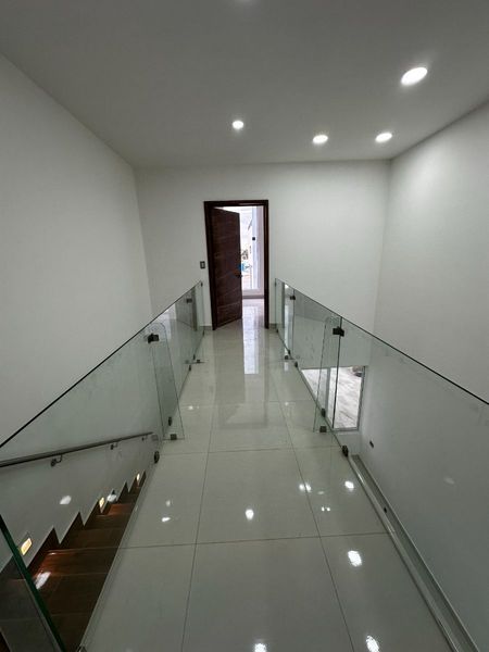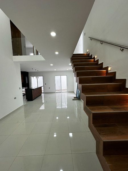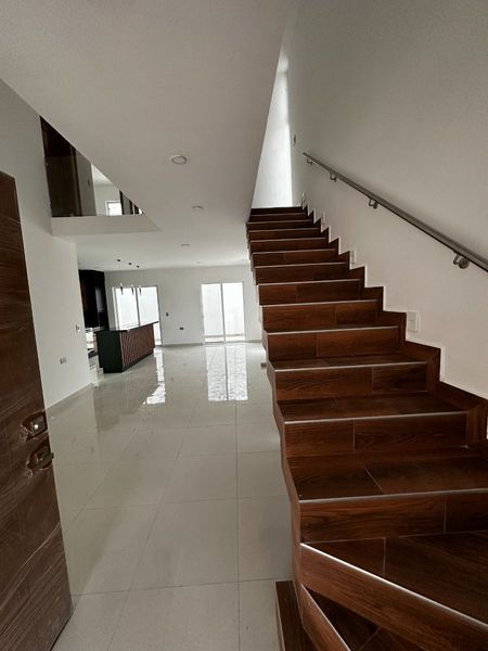 Planta alta: recamara principal con vestidor, baño y balcón, pasillo a doble altura, 2 recamaras con closet cada una y comparten un baño completo, 1 vertedero, canceles de baño con vidrio templado, espejos de baño con luz led.