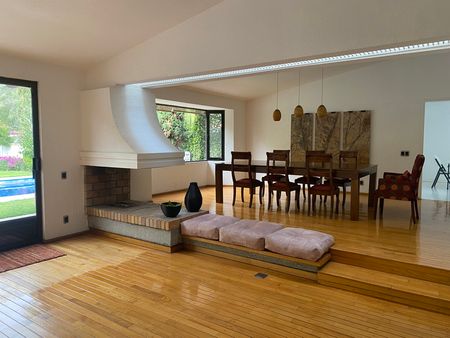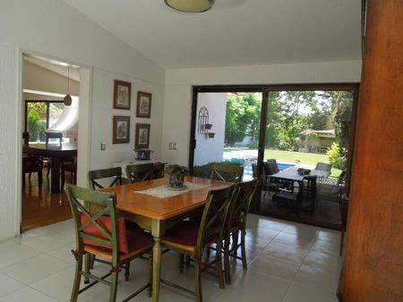 Sala, comedor y antecomedor con hermosa vista a un jardín arbolado