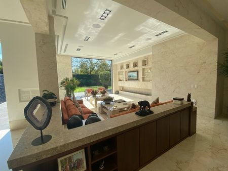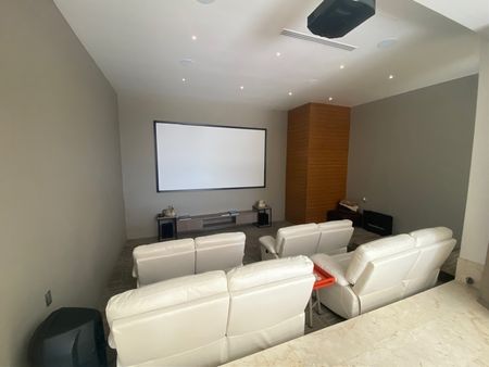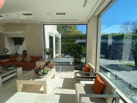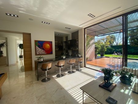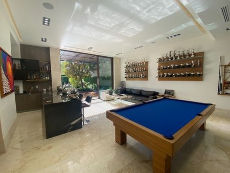 Cuarto de juegos con cine, antecomedor, barra y sala la cual se integra a una terraza espectacular y da al jardín principal.