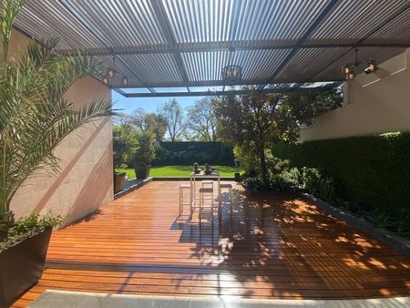 Sala, comedor, antecomedor unido a la cocina y a un jardín trasero.