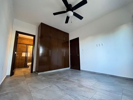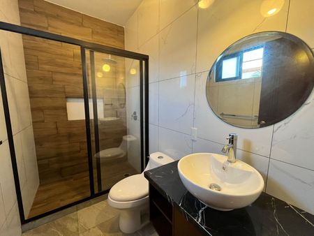 Sala comedor, cocina integral equipada con estufa, campana y barra desayunadora en granito, medio baño para visitas, cuarto de lavado techado, área de tendido, recámara principal con baño completo, balcón y doble vestidor