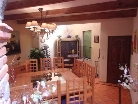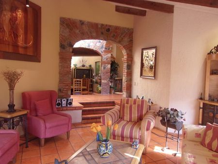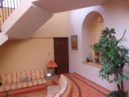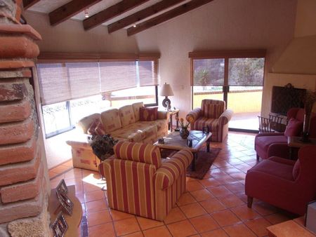 Casa estilo colonial Mexicano en calle cerrada con vigilancia 24 hrs. Vestíbulo, baño de visitas, sala principal, comedor, sala de televisión, 4 recamaras con baño, family room, cocina, antecomedor, terrazas y jardín.