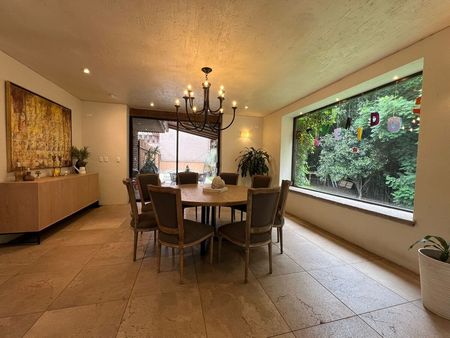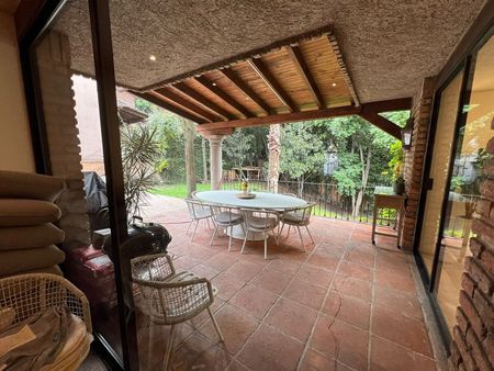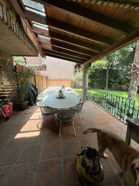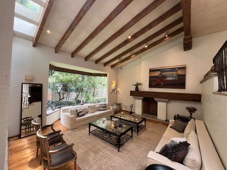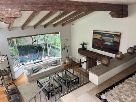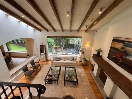 Sala con chimenea, techos altos con vigas de madera, con vista al jardín