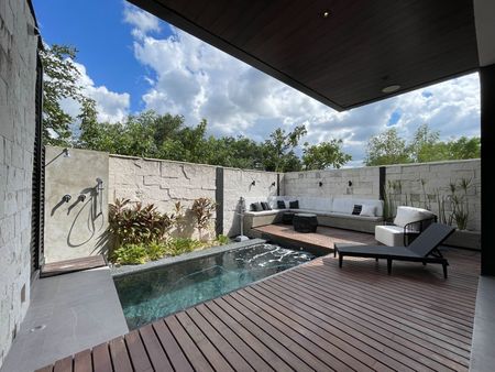 -Piscina con asoleadero con deck de madera dura TZALAM y regadera independiente.