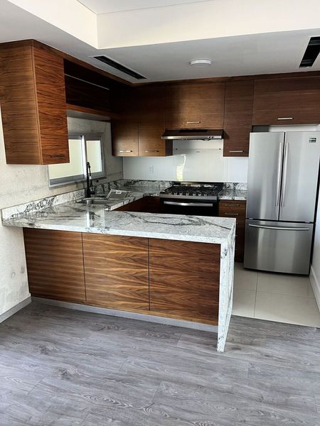 Cuenta con sala comedor, cocina, 2 recamaras, la principal con baño propio y closet vestidor area de lavado y una terraza de 50 M2.