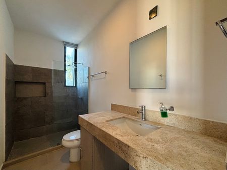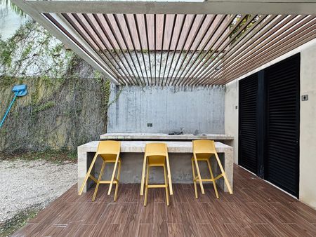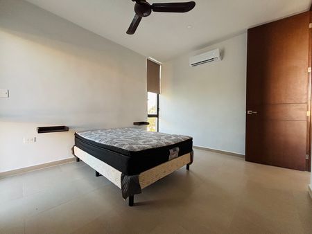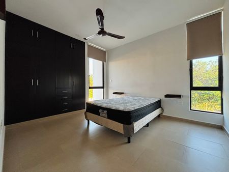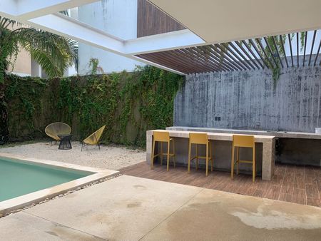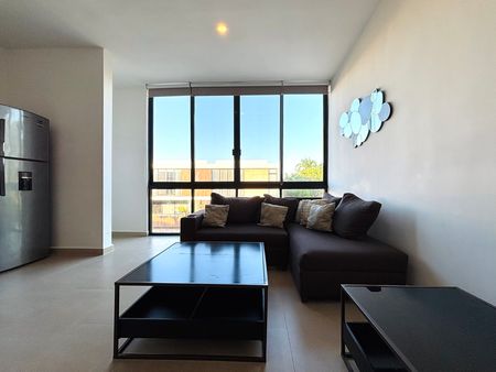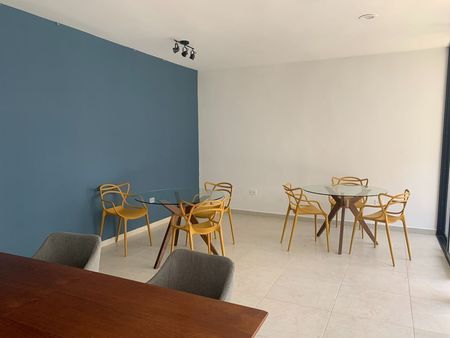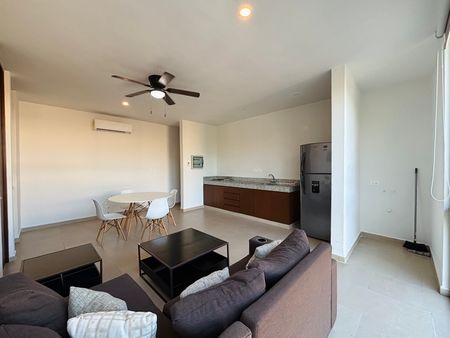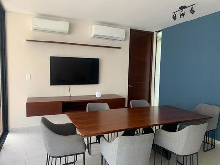 Se renta departamento completamente amueblado en el complejo Taiga, ubicado en una de las mejores zonas de Mérida, en Montebello. Cuenta con seguridad y acceso controlado 24h, piscina, bar, área social climatizada con televisión, sofá y mesas.