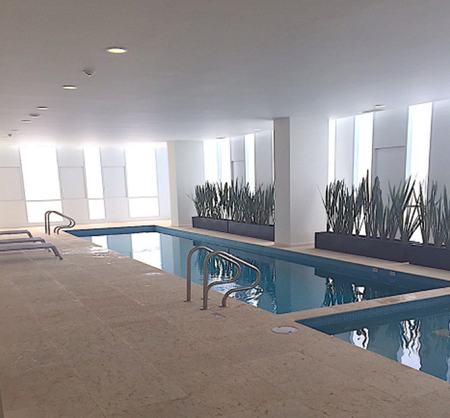 Recepción, business center, alberca techada, gimnasio (con área de baños, regaderas y vapor), 2 canchas de pádel, jardín