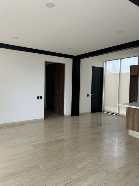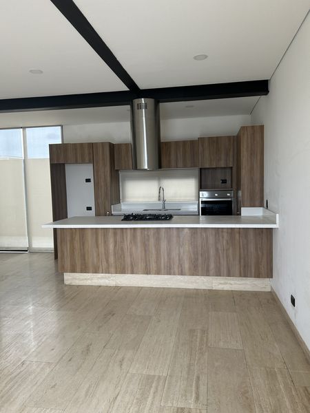 Departamento en primer nivel con amplia estancia, cocina equipada abierta, área de lavado techada y patio trasero.