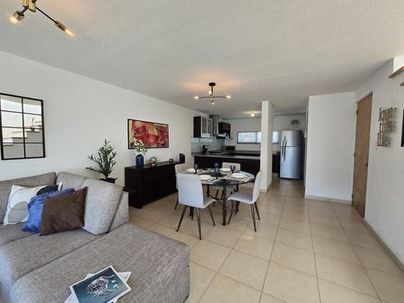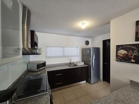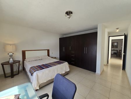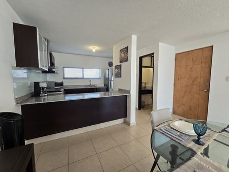 Departamento en venta amueblado, ubicado en Fraccionamiento Residencial Juriquilla Santa Fe, dentro de Condominio El Encanto, con excelentes amenidades: alberca, gimnasio, palapa, área de juegos infantiles, acceso controlado, vigilancia las 24hrs., estacionamiento para visitas. Departamento amueblado de dos niveles, con sala, comedor, cocina integral equipada, terraza, área de lavado, medio baño de visitas; planta alta con dos recámaras con baño y clóset. Cochera para dos autos.
