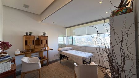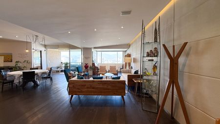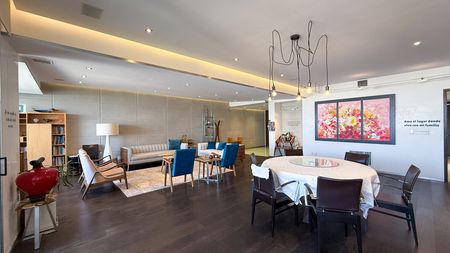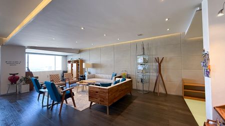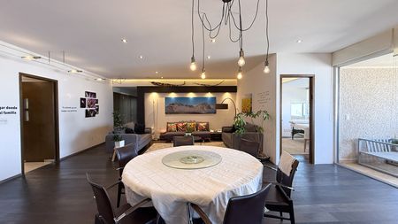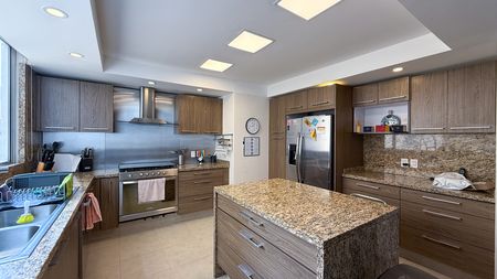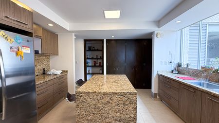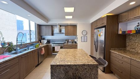 El área social: una sala y comedor de concepto abierto y una sala de estar secundaria. La cocina, equipada con cubiertas de granito y carpintería.