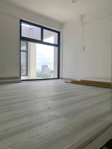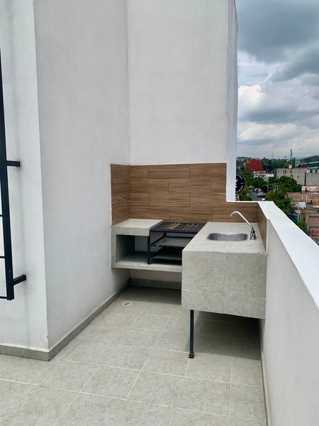 Departamento de 30m2 tiene una estancia con cocina abierta, una recamara, un baño, área de lavado y un lugar de estacionamiento para moto