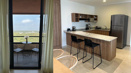 • Cocina, barra desayunadora, estufa electrica, microondas y refrigerador