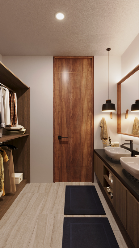Meseta de granito en cocina, meseta de granito en baños, apagadores inteligentes en pasillo y recámaras, cerradura digital, calentador eléctrico, cristal templado en baños con puerta, closets vestidos, gabinetes inferiores y superiores en