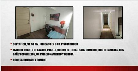 CUENTA CON ESTUDIO, CUARTO DE LAVADO, PASILLO, COCINA INTEGRAL, SALA, COMEDOR, DOS RECAMARAS, DOS BAÑOS COMPLETOS, UN ESTACIONAMIENTO Y BODEGA.
