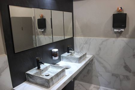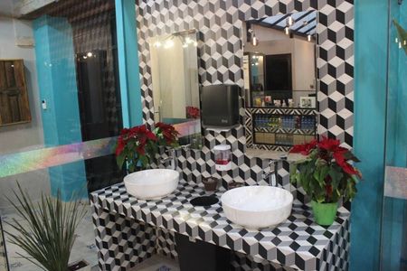 Recibidor con lavamanos, puerta de acero y ventanal de vidrio templado