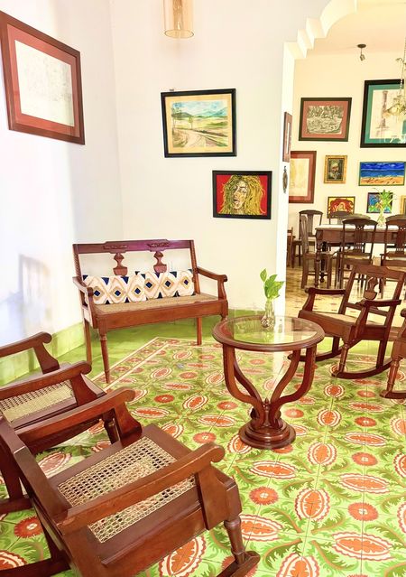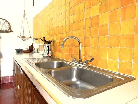 Las fotos muestran la amplitud de sus áreas sociales, como la sala y el comedor, decoradas con arte. La cocina, con sus llamativos azulejos amarillos, es un espacio funcional y lleno de vida. Las habitaciones son frescas, amplias y acogedoras, ventanas con cristales coloridos permiten el paso de luz con estilo.