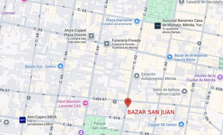 Se Vende 1 local comercial en la PLAZA BAZAR SAN JUAN, se ubica en la calle 62 por 67 del centro histórico de la ciudad de Mérida. Se ubica a 3 esquinas de la plaza central y de la catedral. El Bazar San Juan es un lugar que está en la afluencia diaria de gente, lo cual garantiza su uso comercial, existe desde hace ya muchas décadas.
