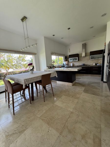 Cocina con desayunador y vista al jardín, cuarto de servicio completo, 4 bodegas, dos pasillos laterales.