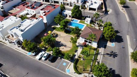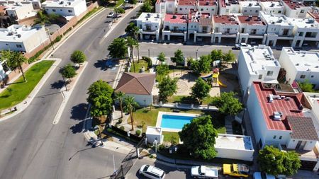 Privada con área común con alberca, juegos infantiles, seguridad 24/7, doble acceso controlado.