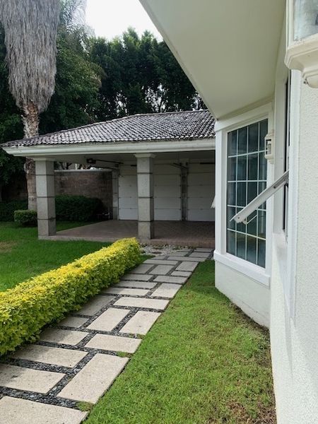 CONSTA DE JARDIN DE 450 MTS COCHERA CON PORTON ELECTRICO PARA TRES AUTOS ENTRADA LATERAL AL INTERIOR DE LA CASA.