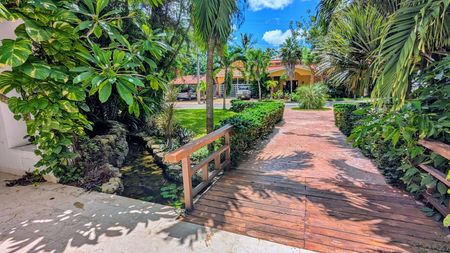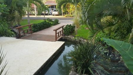 Hermoso Jardín delantero, con cascada, riachuelo y lago, exhuberante vegetación y estratégicamente iluminado.