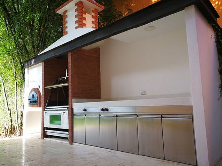 Terraza techada que da a la Alberca, jacuzzi dividido en agua fría y caliente, Horno de leña, asador, amplia parrilla.