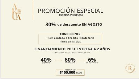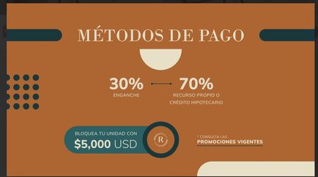 Métodos de pago: 30% enganche + 70% crédito hipotecario/recurso propio.