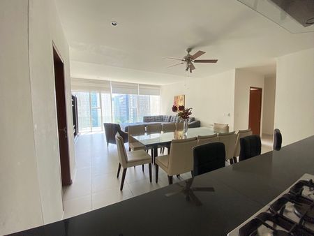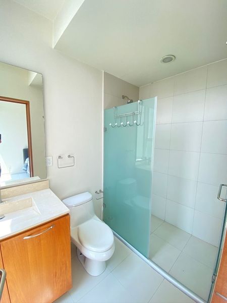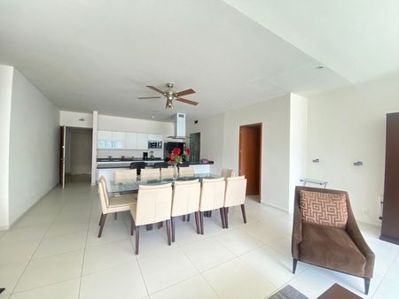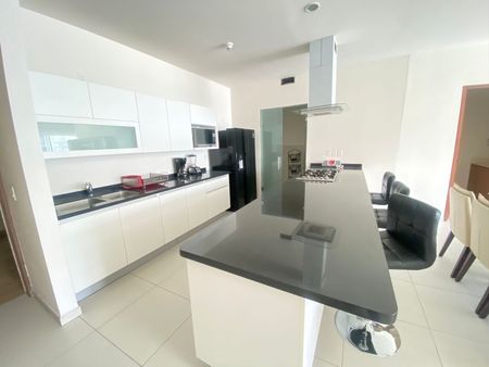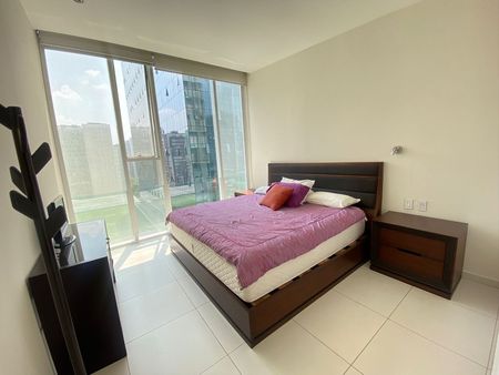 Amplia estancia sala comedor con cocina abierta, medio baño de visitas, 3 recamaras cada una con baño completo. La recámara principal con walking closet. Todo el departamento es muy iluminado. Todas las ventanas con cortinas traslúcidas y black out electrico.