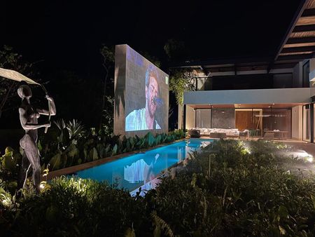 • Swimming pool with lap lane, water wall that doubles as a projector screen, and landscape lighting