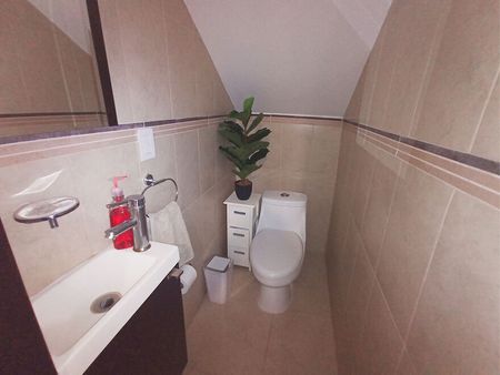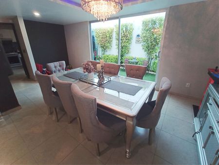Planta Baja: Cochera abierta para 2 autos, estudio cerrado/ home office, amplia sala, comedor para 10 personas, espacio para cantina, baño de visitas, cocina equipada, cuarto de lavado, jardín trasero con pasto sintético.