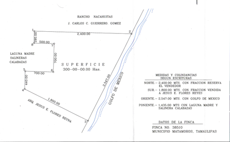 300 Hectáreas. cuenta con 1 Lado de 2,400 m2, otro de 1,800 m2, un frente de: 2,547 m2.