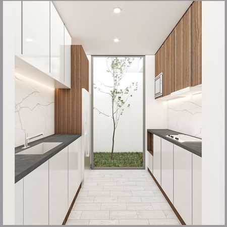 -Cocina integral totalmente equipada con barra de granito, parrilla de gas, campana moderna de acero inoxidable, horno de gas, doble tarja con monomando e iluminación led.
