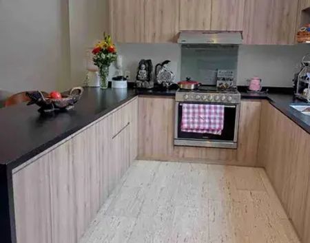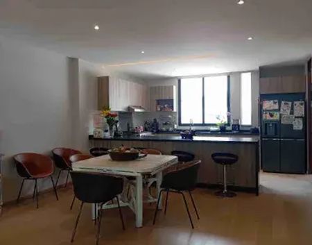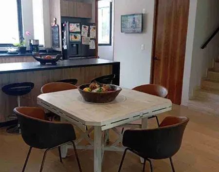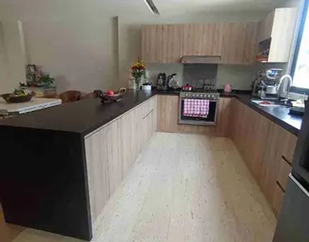 El acceso principal le recibe con una espaciosa estancia de concepto abierto que integra sala y comedor, bañada de luz natural gracias a sus amplios ventanales y a un balcón ideal para disfrutar del aire fresco. La cocina gourmet, con barra de granito, pisos de mármol y equipamiento de primera, es perfecta para el arte culinario. Completan este nivel un medio baño con acabados de lujo, área de servicio discreta y una práctica bodega interna.