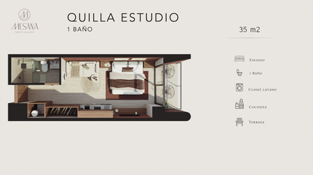 Gran diseño de espacio abierto, con área integrada de sala de estar, dormitorio con closet, cocineta, closet de lavado, terraza y un baño completo. Estacionamiento para un auto.