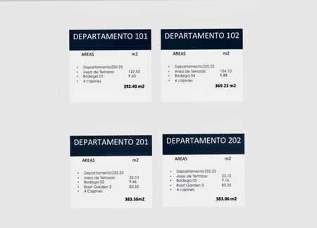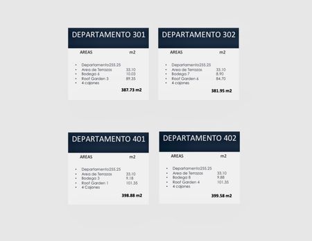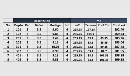 Departamentos desde 369.23 m2 hasta 399.58, todos con 255.25 m2 habitables.