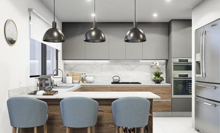 • Cocina integral con cubierta en cuarzo, barra desayunadora y área de cava.