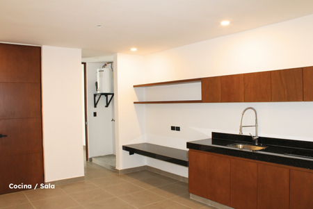 - Área de cocina equipada con refrigerador, tarja y estufa de inducción
