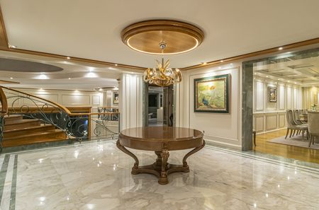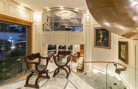 Al ingresar, un elegante vestíbulo y una espectacular escalera de mármol, coronada por un hermoso vitral con motivos florales, le dan la bienvenida a esta residencia única.
